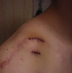 夜シャワーを浴びるため肩にビニールを貼る前カミさんが 『傷、どんな風なの?』 と聞いてきたので 『2㎝位の小さな傷だよ』 と言いながらガーゼをめくって見せた。