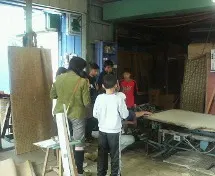 まず、畳屋がどういう仕事かを説明し、畳の構造の説明、畳職人の道具を見てもらい、機械縫いと手縫いの違いを見てもらった。