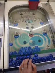 大き目のビー玉(ガラス球)をはじき、点数の穴に入ると台の上からガラガラとガラスの上を落ちてくる。