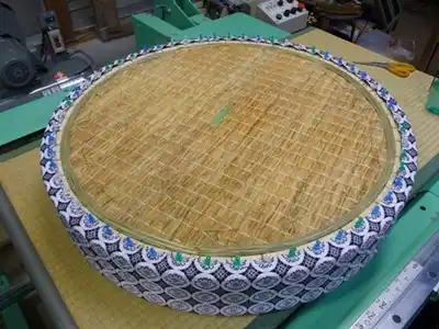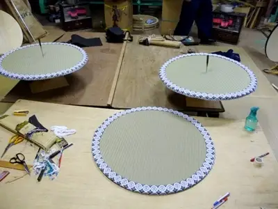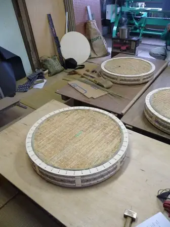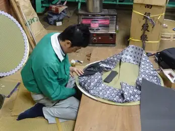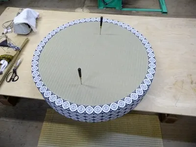 ゲージに合わせ切り抜いた円形の表に、円形に合わせ縮めた紋縁を畳表の中心に糸を張り花菱の筋を見ながら仮留めし、返してから平刺し縫いをします。