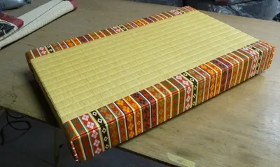 上前、下前両方の縁の絎け縫いが終わったら、繧繝縁一畳台(両面四方板入れ、流備表継ぎ仕様)の完成です!