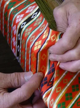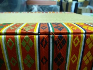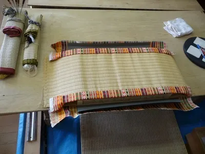 表継ぎの作業が終わりましたら繧繝縁の筋を合わせながら絎けていきます。