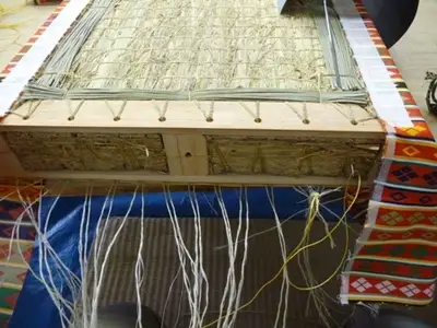流備(龍鬢)の経糸に糸を絡め土台に縫い付けていきます。