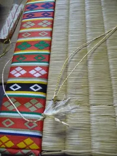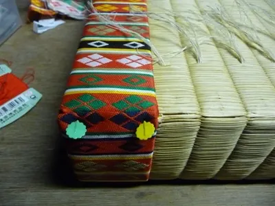 それから裏茣蓙の角を作り上茣蓙を乗せイ筋、繧繝の筋も見ながら表を張ります。