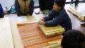 上茣蓙の寸法を確認し、余分なカマチ部分のイグサを抜き取ります。