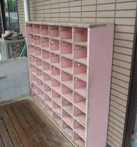 下駄箱の材質はコンパネ、雨に鰍ゥっているのでペンキは剥がれベニヤ自体も大分傷んでおりました。
