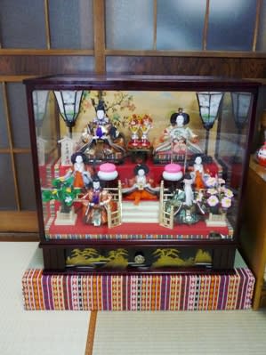 末っ子のお雛様はガラスケース入りの小さな物ですので飾りは簡単なのですが、長女の物はいつも全て出すのが大変でお内裏様とお雛様のみ、人形の大きさに合わせ作った繧繝縁の畳に座らせるだけの省略飾りでした。