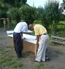 作業内容は、スノコ作りや扉の取り付け、絵画の壁面取り付け、跳び箱運搬台の製作、飼育小屋の補修です。