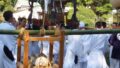 円形ミニ畳を持って記念撮影