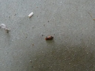 カツオブシムシ、体長3㎜ほどの甲虫で成虫はマーガッレトなどの白い花に集まり花粉をエサとしますが幼虫時は暗い所、風通しの悪い場所を住処とし、衣類(セーター)などの繊維質を食害します。