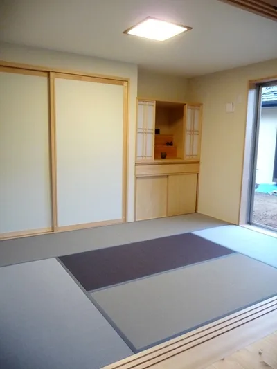 ハウスメーカーさんから畳だけ抜いて頂け、以前の母屋で約3年前に入替えたばかりのワラ畳を寸法を直して使用、セキスイ美草目積カラーの2色を使い、表替えでの一本縁仕様です。