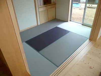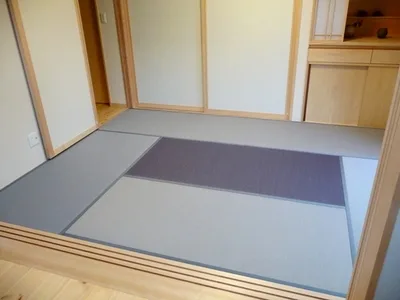 使用した色は周りの縁付き畳はグレー、真中のヘリ無しはブルーバイオレットです。