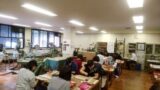 2校合わせ6年生の生徒59人が円形ミニ畳、石膏、本立て、お饅頭、鯵の姿造り、タオルドレスのお手拭き、銅板レリーフ、フラワーギフト、ミニバックという9職種の課題、それぞれにチャレンジです。