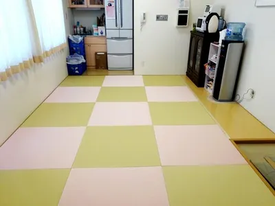 ちょっと紹介が遅くなりましたが先月末に施工しましたダイケン和紙表、清流カラー 薄桜&黄金色、2色使いヘリ無し半畳の施工例です。