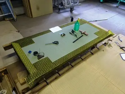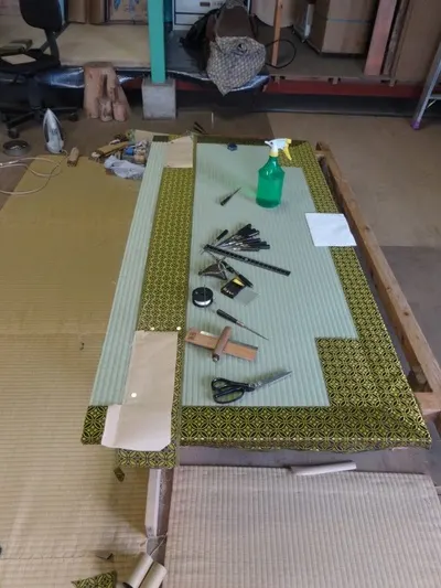 ※当初、拝敷の張り替え?!という事で話をお受けしたのですが、TTM浜田先生の拝敷は畳表2~3枚までの物で台座(厚み)のあるものは礼盤というお答えから、四天付礼盤の張り替え仕事とします。