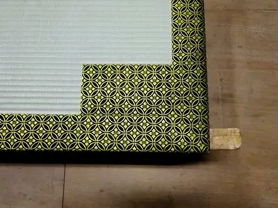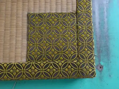 台の寸法を直し裏打ちしたゴザ縫いで仕上げようかとも思いましたが、1寸厚のワラ床でしたのでムラをかい、四方の縫い止めをし、土台の修正を済ませてから同じようにカマチを巻き、縁を付ける事にしました。
