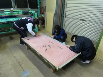 カマチ、返しの鋲を抜いてもらい、サンダーの糸を抜いてもらったら私が寸法を当たります。