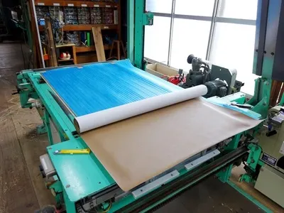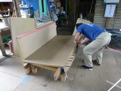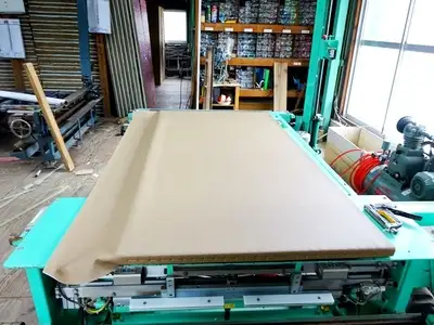 寸法を確認後、ブルーマット(クッション)を間に入れ、塩ビシートのわんにゃんスマイル畳表を逢着します。