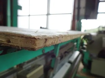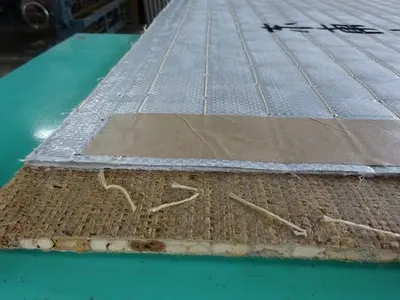 13㎜仕上がりの薄畳、カマチ留めのホチキスを取り除き、畳表を剥がしてみると私は初めて見るタイプ、2分厚のベニヤに上下にャ潟Xチレンのシートが縫い付けてあります。