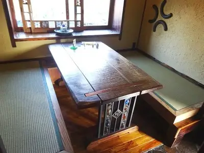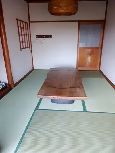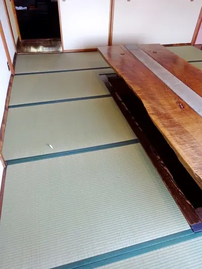 10畳間の真ん中は足を下すため掘り下げ(堀コタツではない)、約8尺の動かない木枠付きです。