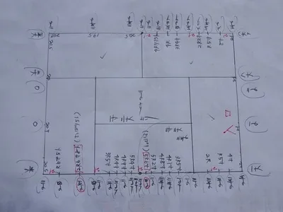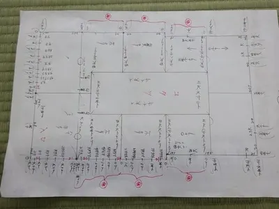 通常の寸法紙に書いてしまうと小当たりが多すぎるため、カレンダーの裏に大きな図面を書きました。