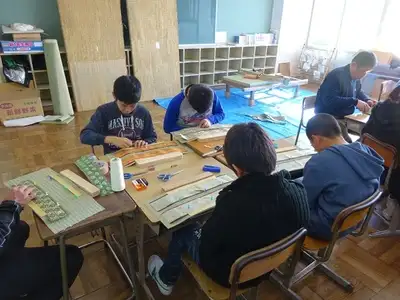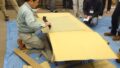 各教室20名の生徒を教えるため私と弟の他、成田市佐合畳店さん、青野畳店さん、柏市ニブヤ畳店さんにご協力を頂き5人体制での‘ものづくり教室’です。