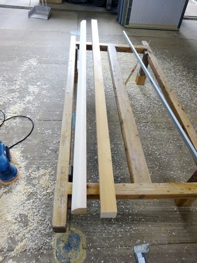 2寸角の赤松クリア材を電気鉋で削り、サンダーをかけ、ジョイント用の金具を埋め込み、蜜蝋を塗ったら完成!