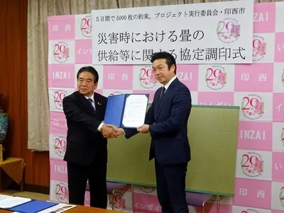 本日、災害時に全国の畳店から新しい畳を無料で避難所に届けるプロジェクト、【 5日で5000枚の約束。 】 と地元の印西市が災害協定を結ぶ調印式に出席して参りました。