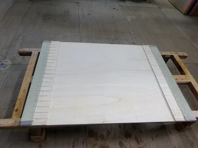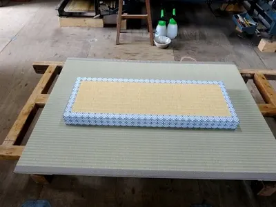 囲炉裏が畳よりも2分ほど高いため、囲炉裏の大きさ(88㎝×88㎝)を除いた両脇に、切込みを入れた2分ベニヤをボンド付けし(ビス止併用)、畳表を絡め縫いして仕上げました。