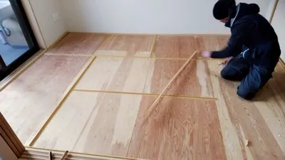 きたろう畳を綺麗に撤去し、床板の清掃を済ませ花たたみHAL(12㎜厚)を納める前に厚みの調整として2㎜厚のベニヤ板を敷きビス留めします。