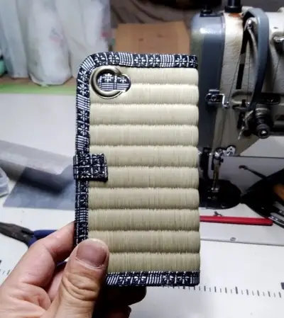 格子模様の畳縁は廻縁を縫う際、カード入れ部分と違い縁がシワにならないよう縫う為、どうしても柄が真直ぐ縫えません。