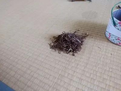 前回、前々回と同じ業者がやっているようで針だらけの畳縁を取り除くとその下にも錆びだらけの前の針が抜かれる事なく打ち込まれています