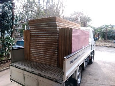 引き取り時はフォークリフトで積んでいただきますが工場へ戻ったら1枚1枚手積みで運びます。