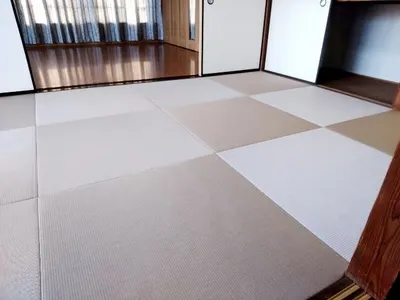 使用したのはセキスイ美草目積カラーモカベージュを使用したヘリ無し半畳市松敷きです