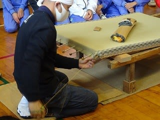 内容は畳の歴史や畳の構造、畳についてや畳職人の道具などを紹介後、ミニ畳のコースターを作ってもらい最後にチョットだけ畳の手縫い実演を見て頂きました。