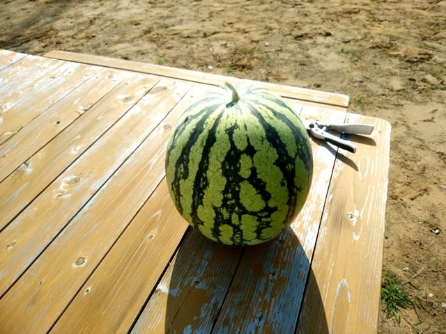 スイカ 2023.07.28 今年の印西市は梅雨でも雨が降らず毎日の猛暑。毎年夏野菜を育てている家庭菜園も野菜が育ちません。 4本植えた大玉スイカの苗もひとつ枯れふたつ枯れと全然実が育ちませんがその中でやっと一つだけ無事に育った大玉スイカ。やっと収穫が出来ました! まずは今年の初物ですので神様にお供えし家族で味わいたいと思います。果たしてちゃんと甘く育ってくれたのか?夏の楽しみの一つです。 #米井畳店 #家庭菜園