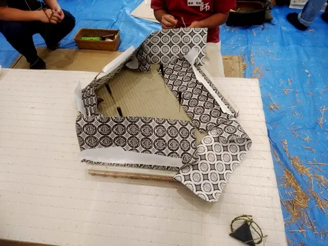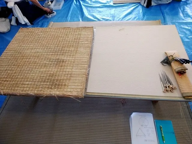 奈良県の浜田畳店様指導の下、3人一組でグループに分かれ作業を進めます。