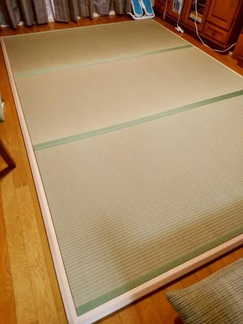 稲わら畳の感触と目筋の通った極厚の畳表にお喜び頂き、リビングに敷いた30㎜厚の置き畳(裏面滑り止め加工)はメーターサイズで作りましたので3枚並びで3ⅿ×2ⅿとサイズ感もピッタリ!