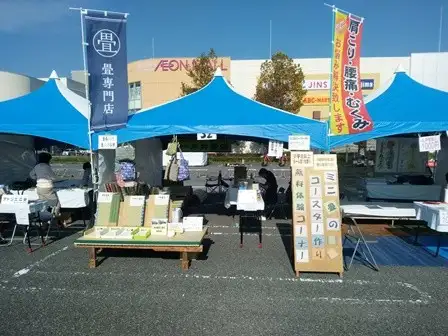 出店場所は29番ブース(イベントステージ前、イオンモール側角)町の畳屋さんの【のぼり旗】とミニ畳のコースターづくり無料体験の行列が目印です!